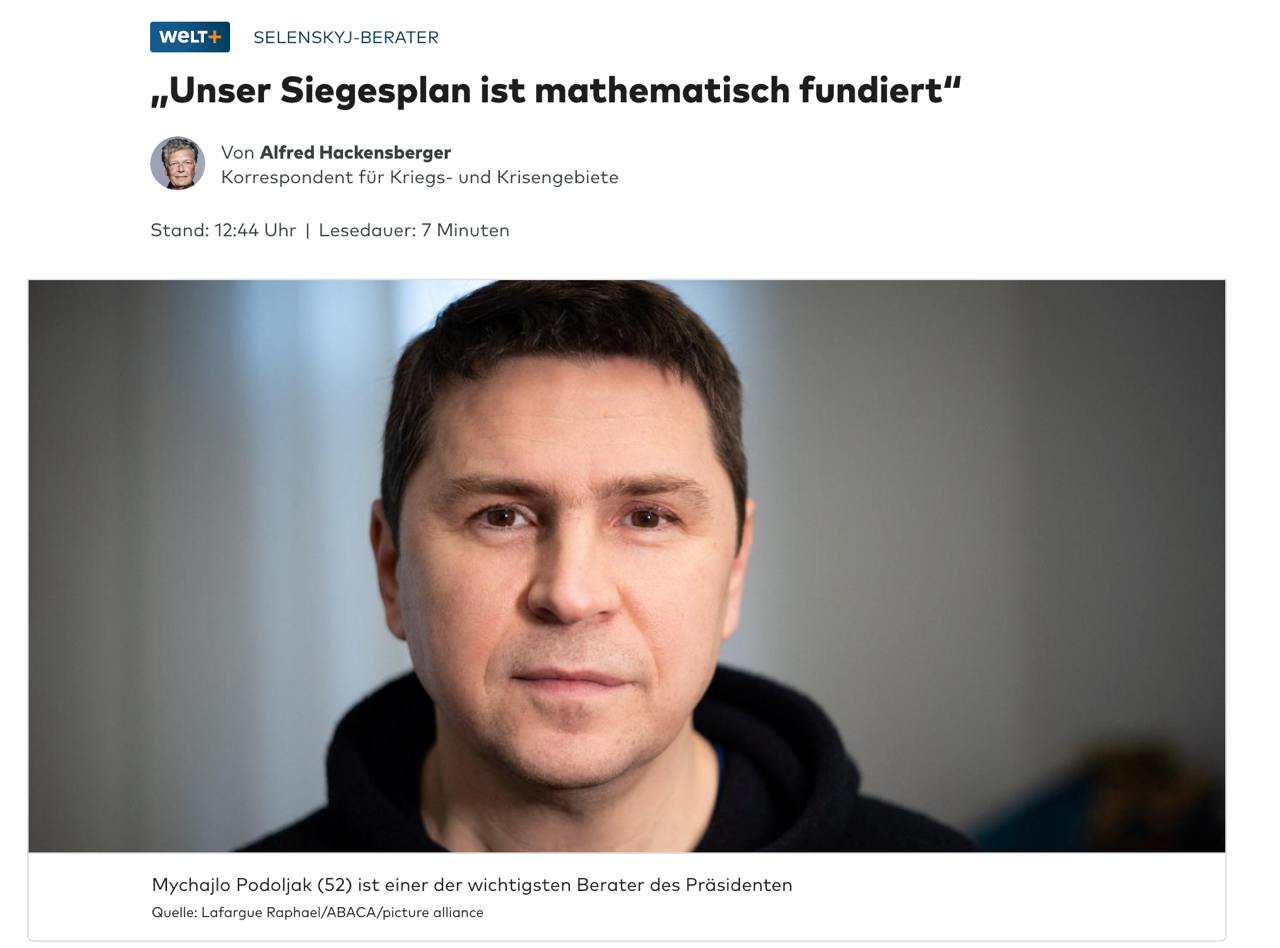 "У нас сьогодні є всі інструменти, щоб змусити Росію програти. Виснаження РФ вже очевидне", - заявив радник голови ВП Михайло Подоляк німецькому виданню Die Welt.