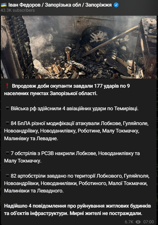 08:12 За добу окупанти завдали 177 ударів по 9 населених пунктах Запорізької області. Про це повідомляє голова ОВ Іван Федоров.