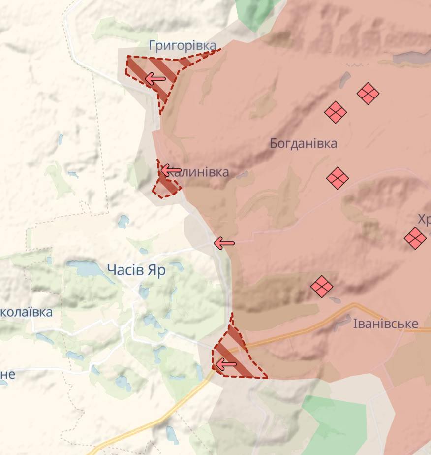 Просування було на південь від міста, де РФ захопила роздоріжжя доріг, яка веде до Годин Яру з Бахмута та Костянтинівки. А також на північ - в районах Калинівки та Григорівки.