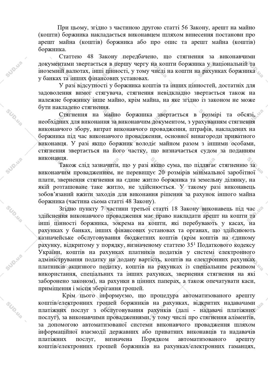 Державний виконавець подає звернення на грошові кошти та майно боржника. Насамперед намагатимуться списати кошти з рахунку в національній та іноземній валютах. Якщо їх немає, то може бути арештовано майно (крім майна, на яке згідно із законом не може бути накладено стягнення). Нагадаємо, у громадянина не можуть забрати останній телефон, стілець та ліжко. На сім'ю повинні залишити по одному комп'ютеру, телевізору, холодильнику, столу та шафі.
