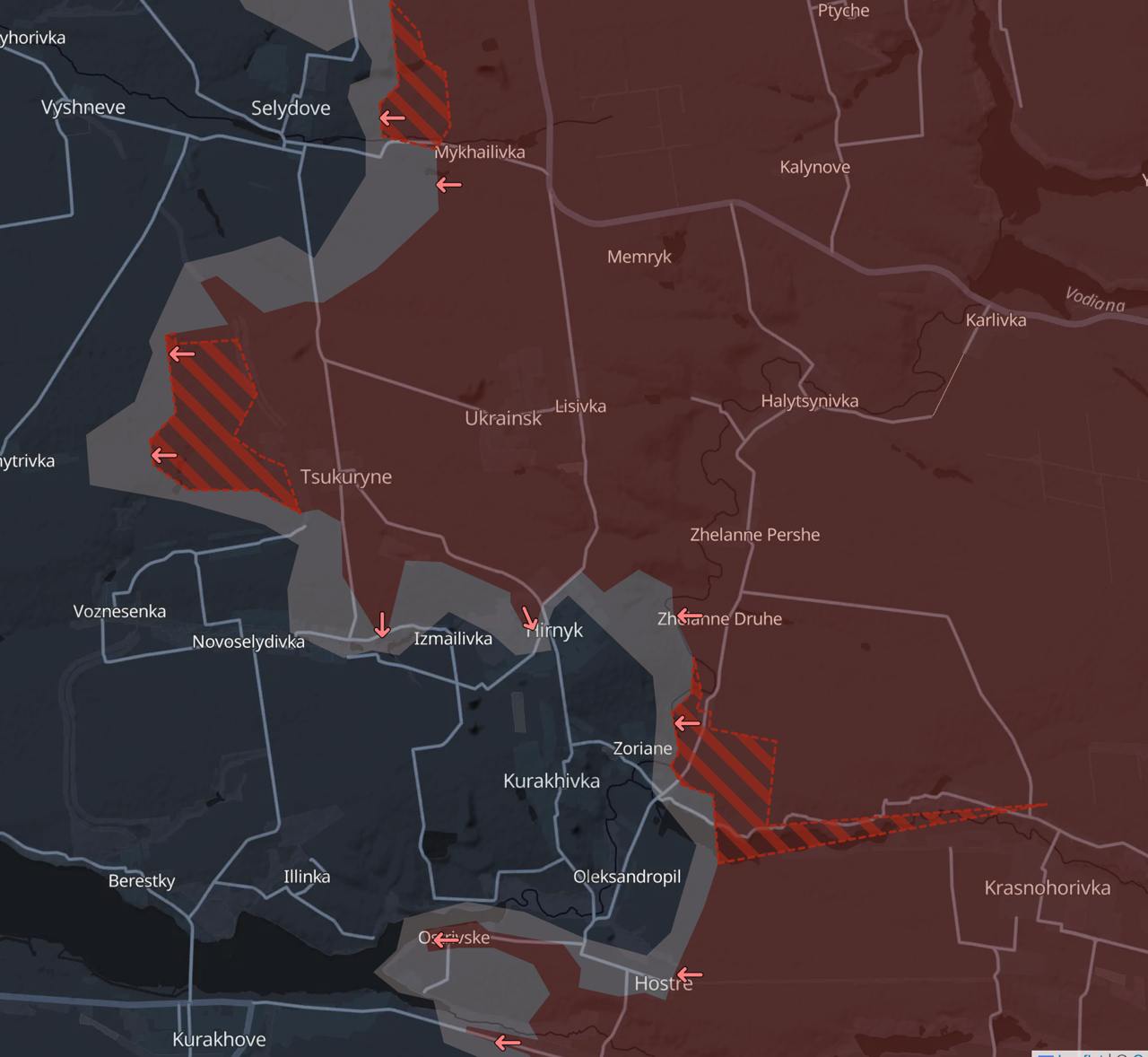 По-друге, паблік показав великі поступи РФ на захід від Цукуріно (в район Новодмитрівки), а також на схід від Курахового, де зменшилося вклинення ЗСУ у російські позиції (район Зоряного).