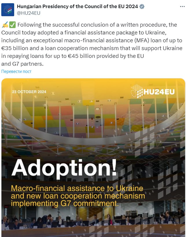 Сьогодні, 23 жовтня, Рада Євросоюзу остаточно схвалила виділення Україні кредиту у розмірі до 35 мільярдів євро за рахунок податків із прибутку від заморожених російських активів.