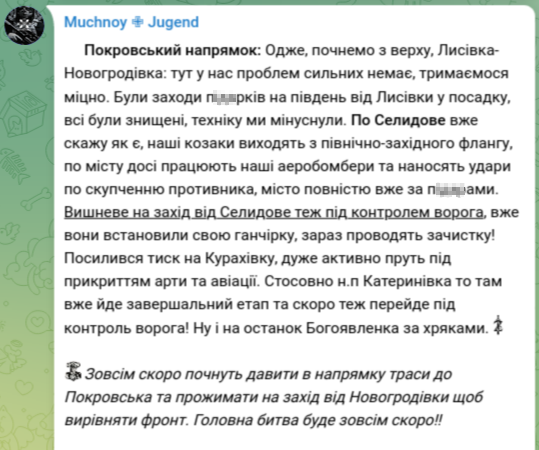 "По Селидово вже скажу як є: наші козаки виходять із північно-західного флангу, по місту все ще працюють наші аеробомбери і завдають ударів по скупченню противника, місто повністю вже за п@д@рами. Вишневе на захід від Селидово теж під контролем ворога, вже вони встановили свою ганчірку, зараз виробляють зачистку! – написав військовий.