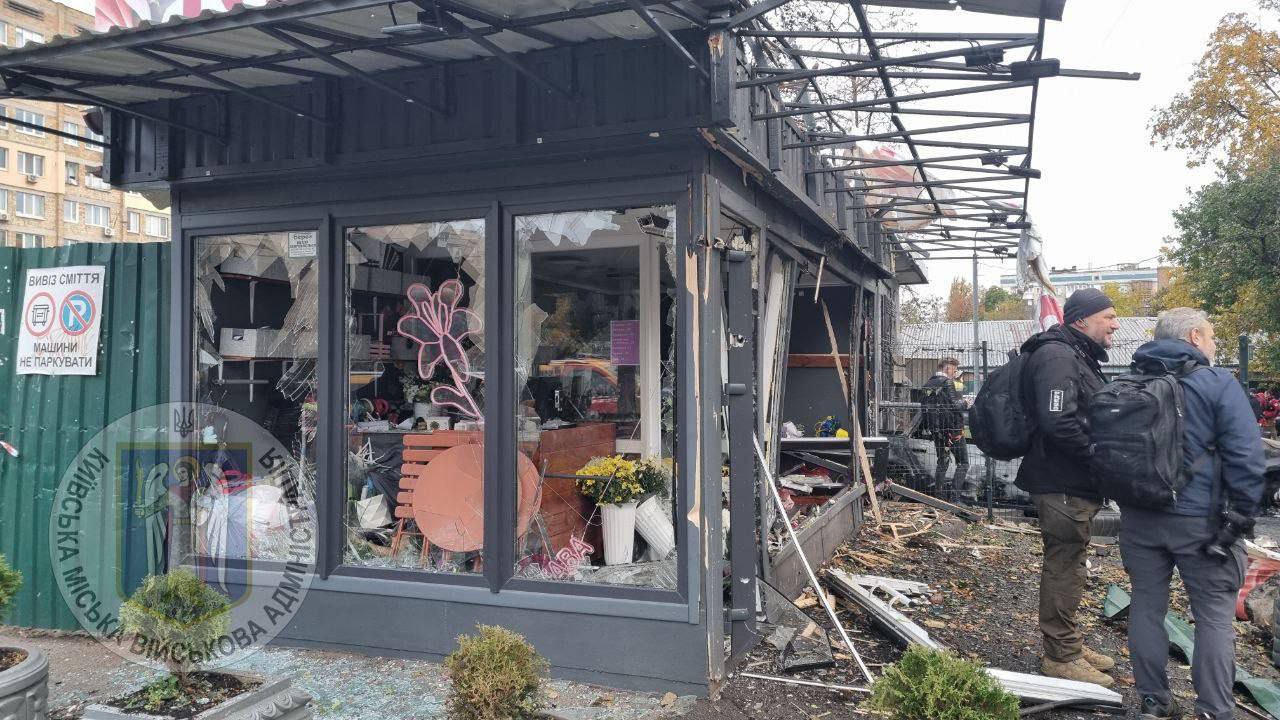 У Солом'янському районі постраждала багатоповерхівка, спалахнув газопровід. Зруйновано магазин, уламки спопелили автомобілі, що стояли поряд.