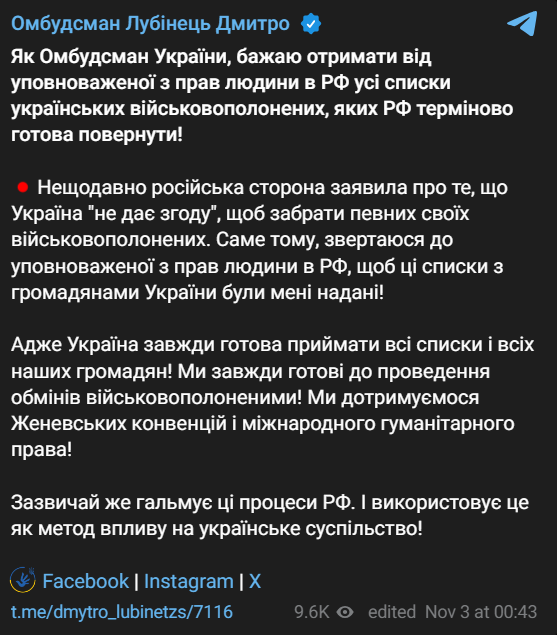 "Нещодавно російська сторона заявила про те, що Україна "не дає згоди", щоб забрати своїх військовополонених. Саме тому звертаюся до уповноваженого з прав людини в РФ, щоб ці списки з громадянами України були надані мені!"