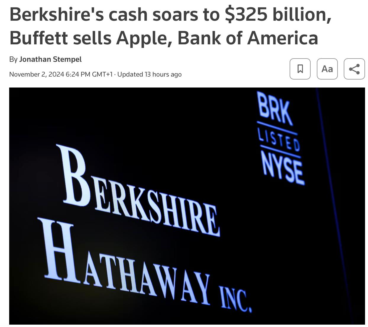 Експерти, опитані Reuters, вважають, що накопичення готівки Баффетом означає "втеча від ризику", "і інвестори можуть турбуватися про те, що це означає для економіки та ринків".
