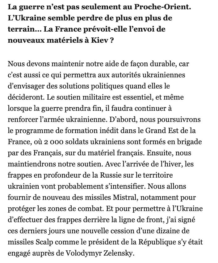 "Щоб дозволити Україні завдавати ударів за лінією фронту, днями я підписав передачу близько десяти ракет Scalp, як це обіцяв зробити президент республіки Володимиру Зеленському", - заявив міністр.