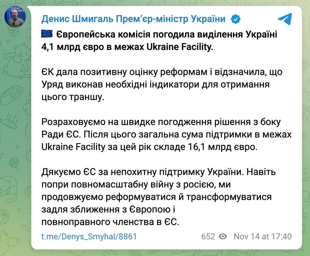 Разом із цим траншем загальна сума допомоги за програмою Ukraine Facility за рік становитиме 16,1 мільярда євро.