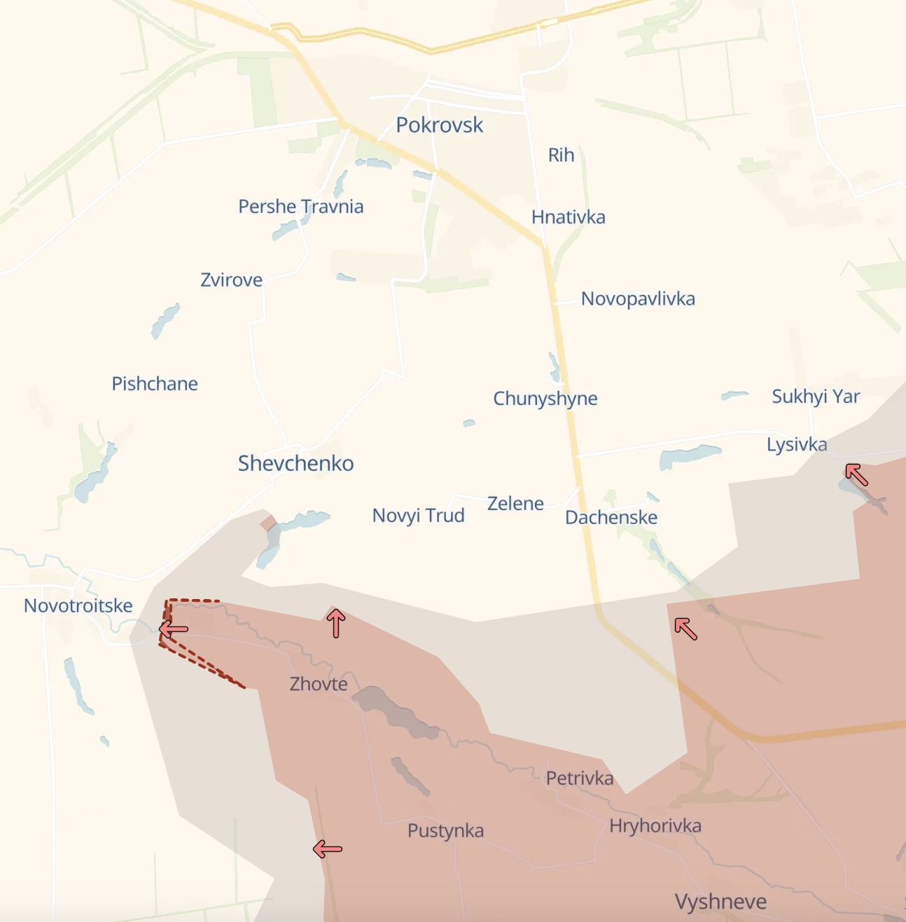На південь від Покровська росіяни підійшли впритул до села Новотроїцьке, захопивши дорогою село Новопустинка. Таким чином зміцнюються позиції РФ у села Шевченка, що має важливе значення, за три кілометри від Покровська, куди росіяни прорвалися напередодні.