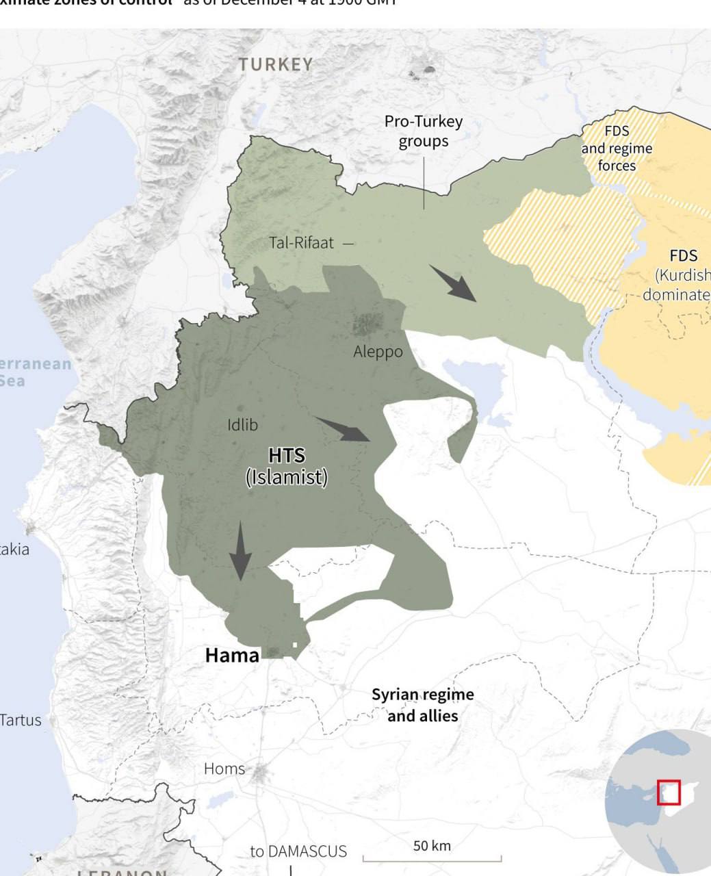 Ситуація в Сирії розвивається за найгіршим для президента Асадом сценарієм. Після падіння фактично без бою другого за величиною міста країни Алеппо, майже без бою було здане й велике місто Хама, яке знаходиться південніше - на шляху до Дамаська.