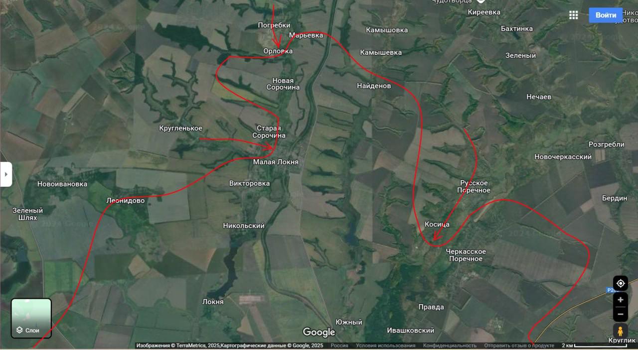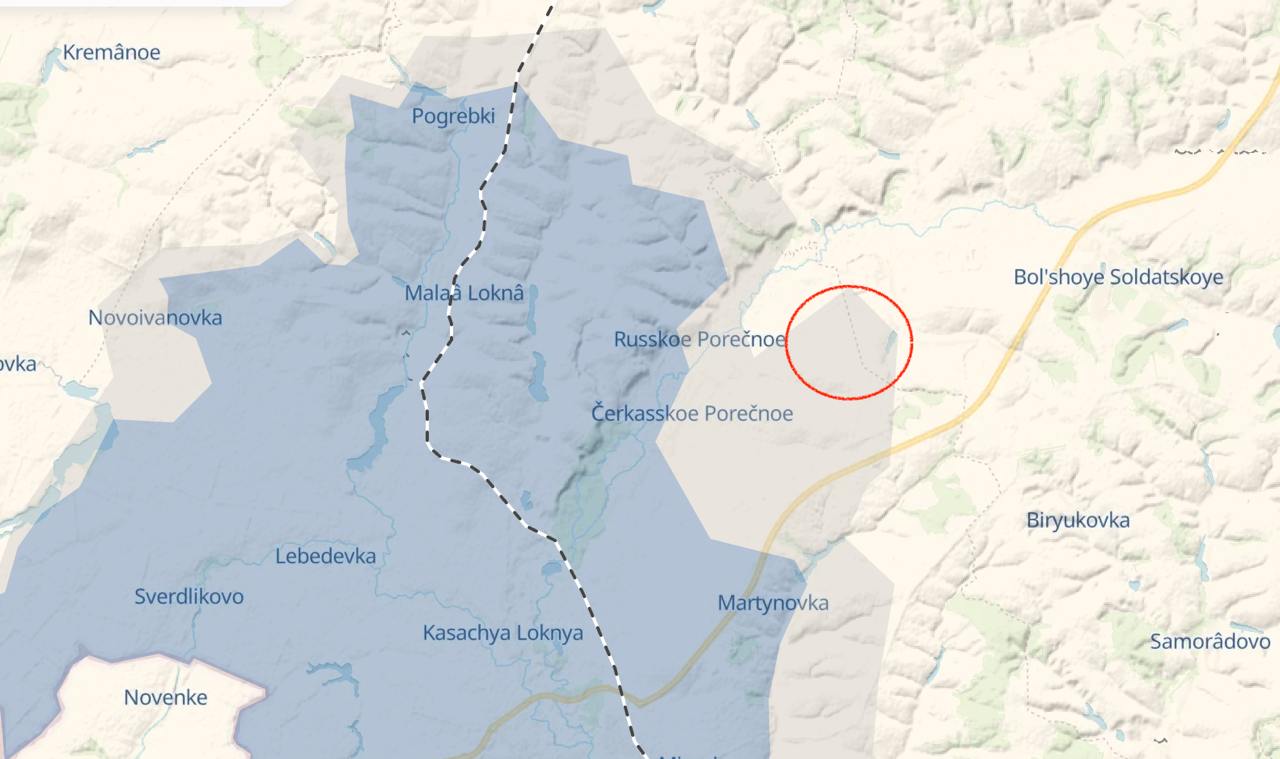 При цьому, зі вчорашнього вечора російські військові телеграм-канали пишуть, що наступ у Курській області перейшла армія РФ (перша карта). Стверджують, що їхнім військам вдалося взяти село Старі Сорочини та увійти до Малої Локні, хоча підтверджень цьому на відео немає. Також росіяни заявляють, що взяли село Погрібки на північ від Малої Локні. Тобто війська РФ намагаються зрізати північну "верхівку" українського плацдарму в Курській області.