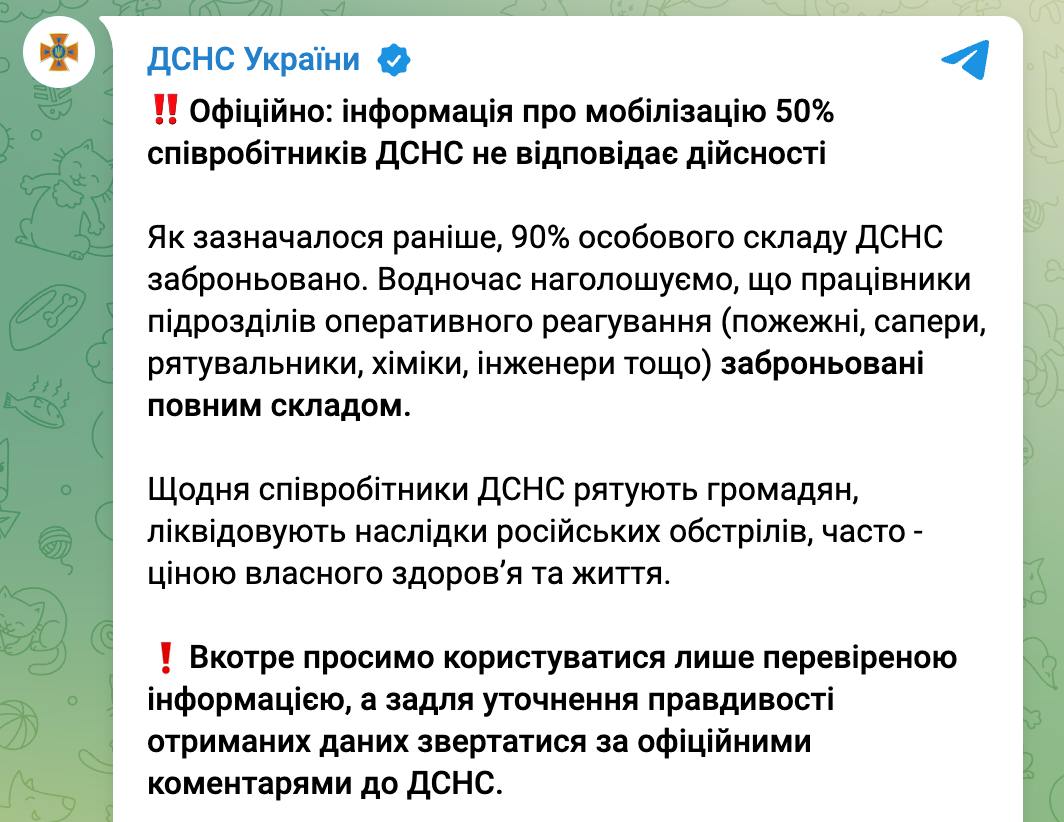 "Як зазначалося раніше, 90% особового складу ДСНС заброньовано. Водночас наголошуємо, що працівників підрозділів оперативного реагування (пожежні, сапери, рятувальники, хіміки, інженери тощо) заброньовано повним складом", - йдеться у заяві.