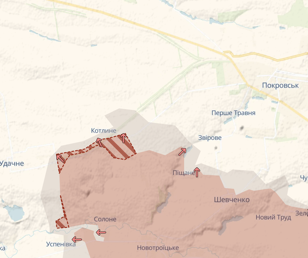 Росіяни знову просунулися в районі села Котліне на захід від Покровська, повідомляє Український військовий паблік Deep State. Війська РФ мають тут успіх уже кілька днів поспіль.