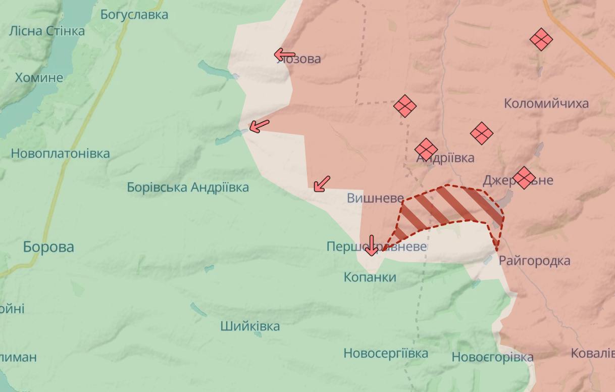 А також на північній частині фронту в Харківській області – захопила суттєву частину Дворічної та просунулась під Боровою.
