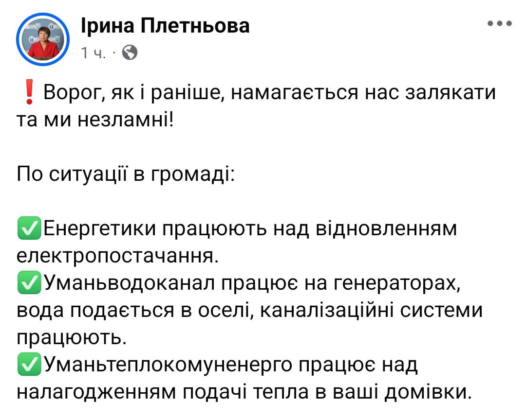 Судячи зі слів мера міста Ірини Плетньової, в Умані почалися відключення електрики та гарячої води.