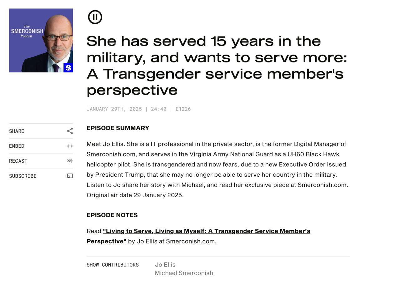 Крім того, у день авіакатастрофи, 29 січня, вийшов підкаст з Елліс, у якому вона розкритикувала указ Дональда Трампа про заборону служити трансгендерам в армії та заявила, що хоче продовжувати службу.
