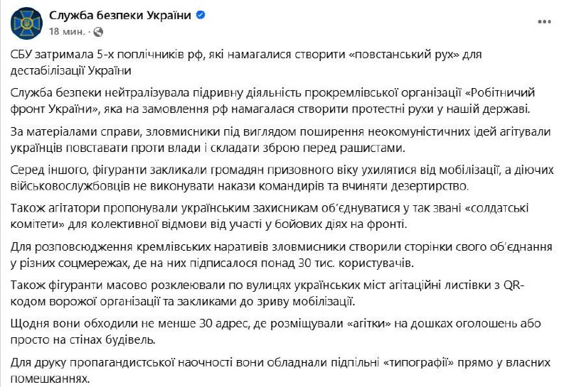 Служба безпеки України затримала п'ятьох членів організації "Робітничий фронт України", які намагалися створити "повстанський рух" та "солдатські комітети".
