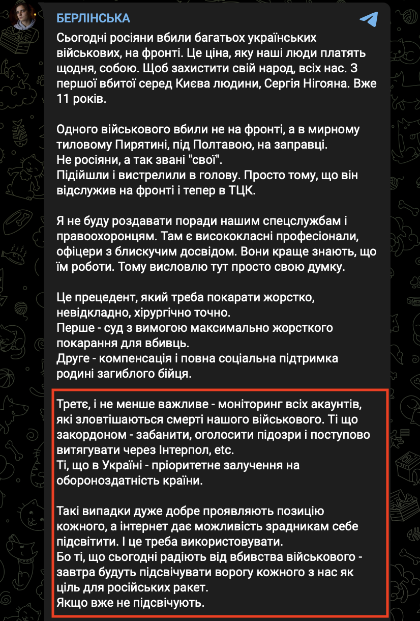 Волонтер Марія Берлінська закликала провести "моніторинг усіх акаунтів, які зловживають на смерті нашого військового. Ті, що за кордоном – забанити, оголосити підозри і поступово витягувати через Інтерпол, etc. ред.)".