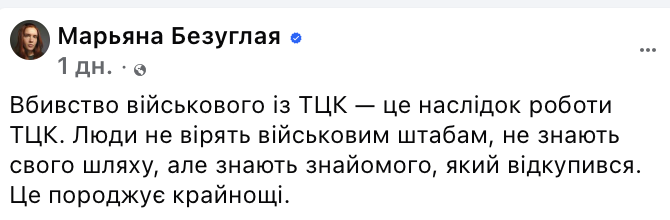"Хто особисто тягнув за руку десятки полковників ТЦК брати хабарі та відмазувати своїх? Забирати людей з оборонних підприємств, знаючи про їхню важливість? Мобілізувати алкоголіків для звіту? Хто?", - додала вона. Безугла уточнила, що не виправдовує вбивство, а сперечається з тими, хто безмовно захищає співробітників військкоматів.