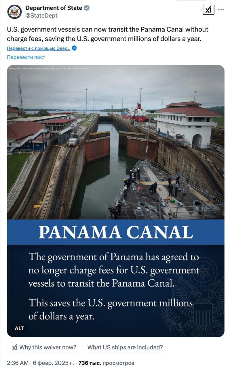 "Уряд Панами погодився більше не стягувати плату з американських державних судів за прохід через Панамський канал. Це дозволяє уряду США економити мільйони доларів на рік", - заявив Держдеп Х.
