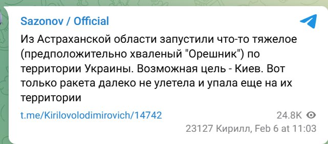 "З Астраханської області запустили щось важке (імовірно, хвалений "Горішник") територією України. Можлива мета - Київ. Ось тільки ракета далеко не відлетіла і впала ще на їх територію", - написав Сазонов.