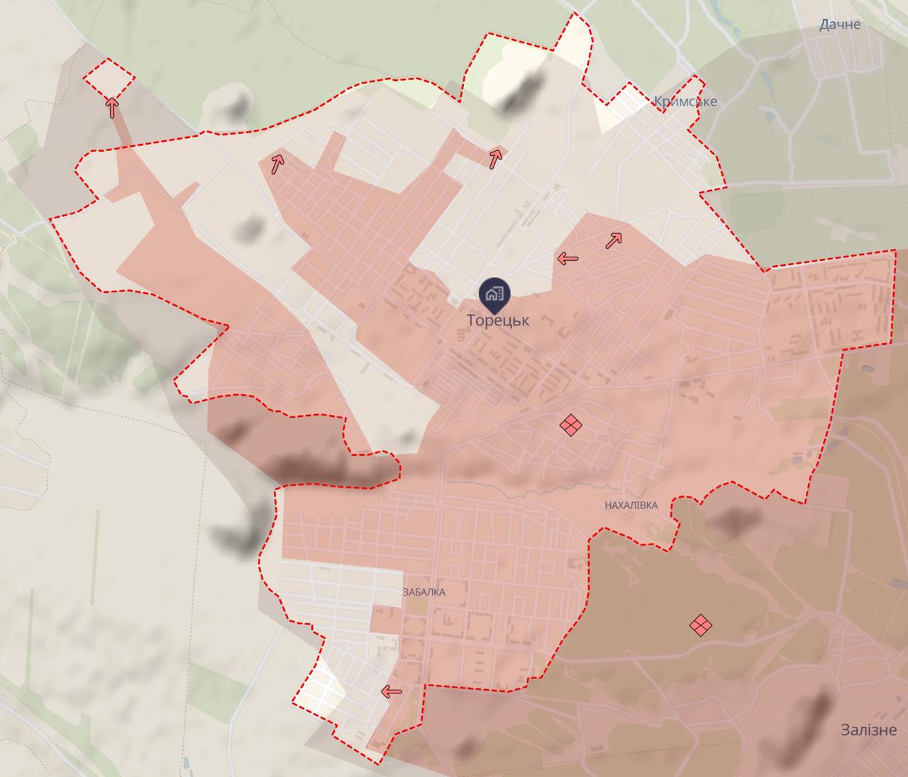 На карті Deep State більшу частину Торецька вказано під контролем РФ або в сірій зоні. Але вказано й кілька невеликих ділянок на околицях під контролем ЗСУ.