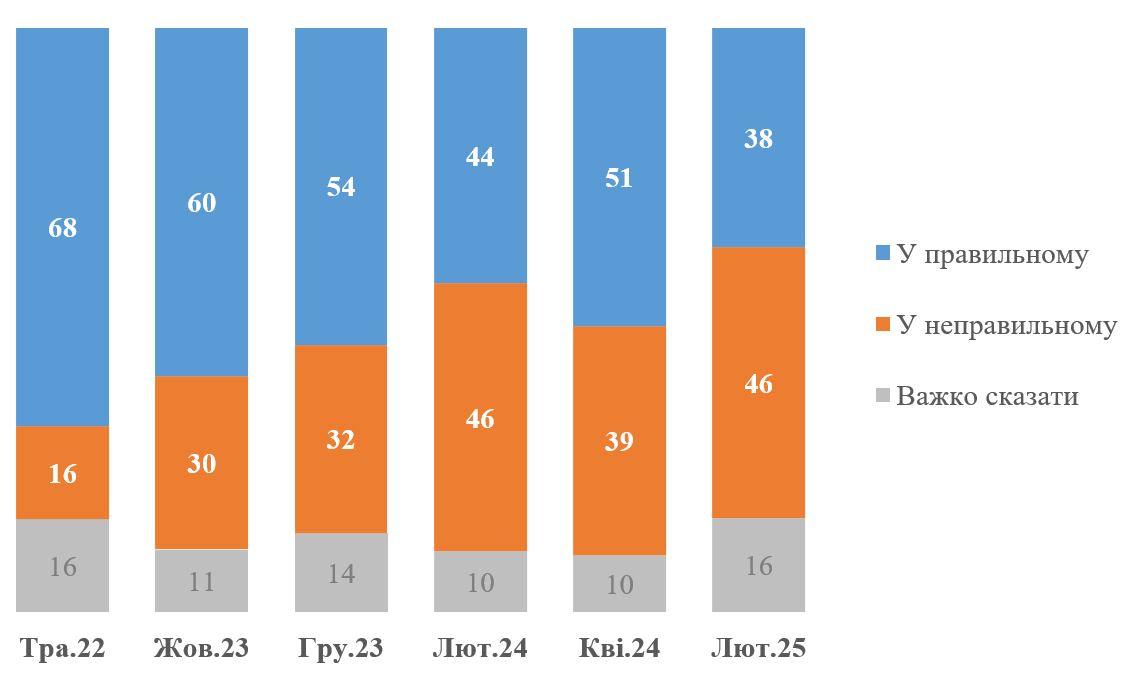 З початку війни кількість незгодних із курсом стабільно зростала до лютого 2024 року (46%). Потім цифра різко впала до 39% у квітні, але до поточного моменту знову дійшла до 46%.
