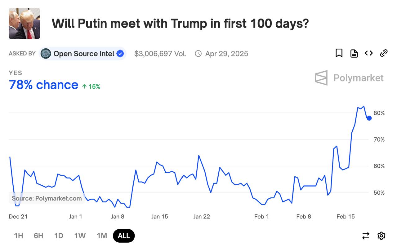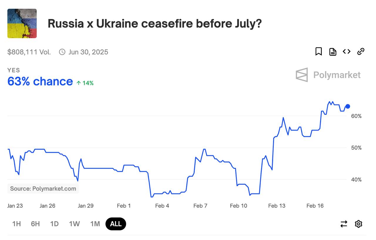 11.01 Ставки на припинення війни в Україні цього року на букмекерській платформі Polymarket зросли до 63%, а на зустріч Путіна та Трампа у найближчі два місяці – до 78%.