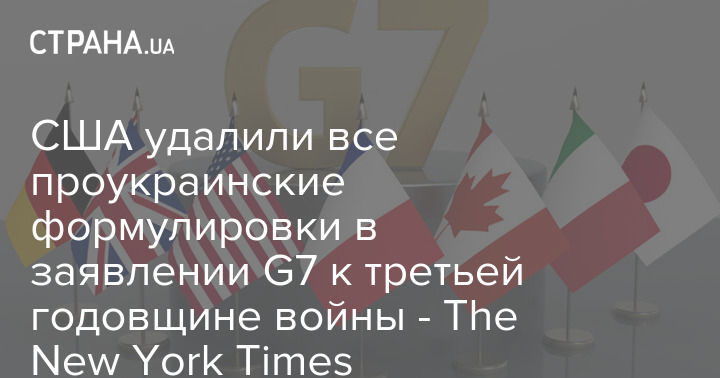У заяві країн G7 ("Великої сімки") до третьої річниці війни США видалили всі формулювання, які можна було б інтерпретувати як проукраїнські, щоб не зірвати мирні переговори.
