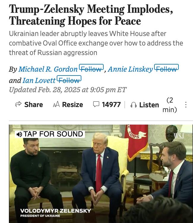 "Раптове завершення зустрічі залишило без відповіді питання про те, яку військову та політичну підтримку адміністрація Трампа готова надати Києву у найближчі місяці", - пише WSJ.