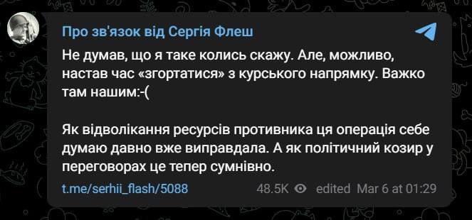 "Можливо, настав час "згортатися" з курського напряму. Важко там нашим. Як відволікання ресурсів противника ця операція себе, думаю, давно вже виправдала. А як політичний козир у переговорах це зараз сумнівно", - пише Флеш.