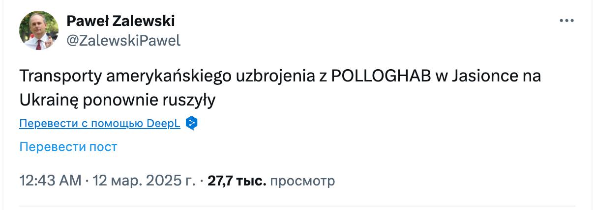 "Знову розпочали транспортування американської зброї через POLLOG HUB (логістичний хаб) до Ясенки в Україну", - повідомив заступник міністра нацоборони Павло Залевський.