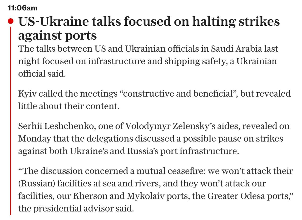 Україна та США під час вчорашніх переговорів у Саудівській Аравії обговорювали також припинення ударів по портах.
