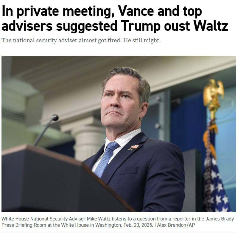 Віце-президент США Джей Ді Венс запропонував президенту Дональду Трампу звільнити його радника з нацбезпеки Майкла Уолтца після скандалу із закритим чатом у Signal, пов'язаного з витоком даних про удари США по єменських хуситах.