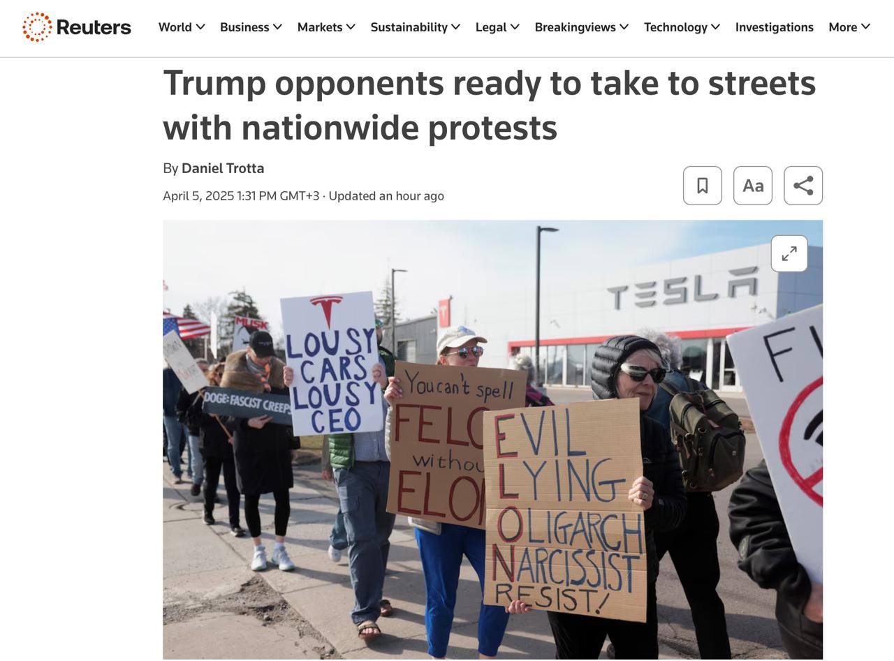 За очікуваннями організаторів, мітинги стануть "найбільшим днем ​​протесту проти президента Дональда Трампа та його союзника-мільярдера Ілона Маска з тих пір, як адміністрація розпочала свої стрімкі зусилля щодо накладення консервативного штампу на уряд".