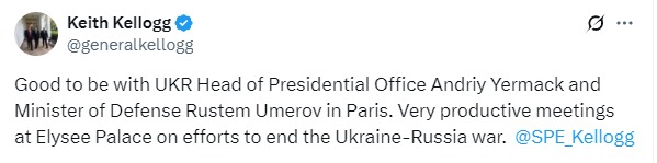 "Радий бути з головою Офісу президента України Андрієм Єрмаком та міністром оборони Рустемом Умеровим у Парижі. Дуже продуктивні зустрічі в Єлисейському палаці щодо зусиль з припинення війни між Україною та Росією", - сказано в публікації.