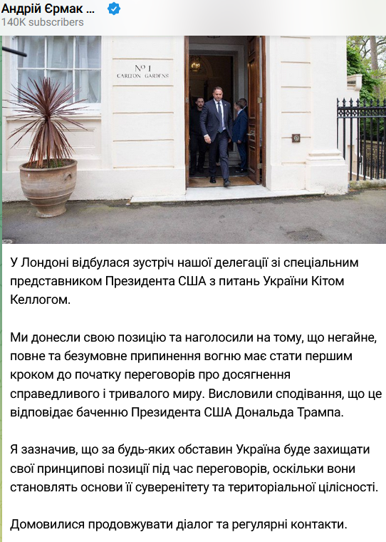 "Донесли свою позицію". На переговорах у Лондоні Єрмак зустрівся із Келлогом. Фото