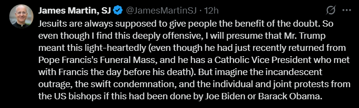 "Як єзуїт, я намагаюся давати людям шанс. Хоча зображення вкрай образливо, я припускаю, що Трамп мав на увазі це як жарт - попри те, що він щойно повернувся з похорону Папи Франциска, а його католицький віце-президент зустрічався з Франциском напередодні його смерті".