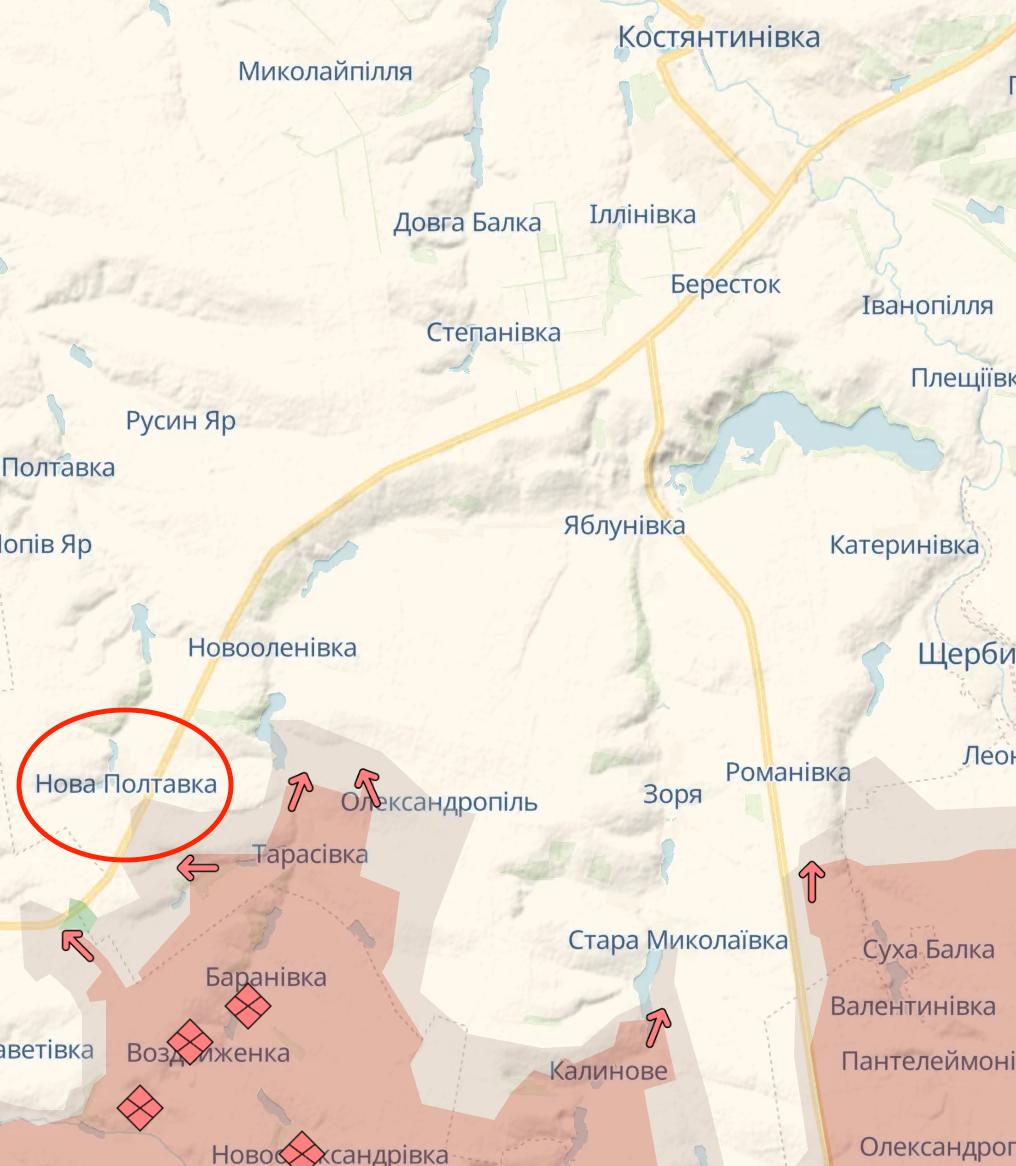 9:40 Армія РФ продовжує просуватися в районі траси Покровськ-Костянтинівка і зайшла вже в Нову Полтавку по той бік дороги, заявляє український військовий Мучний.