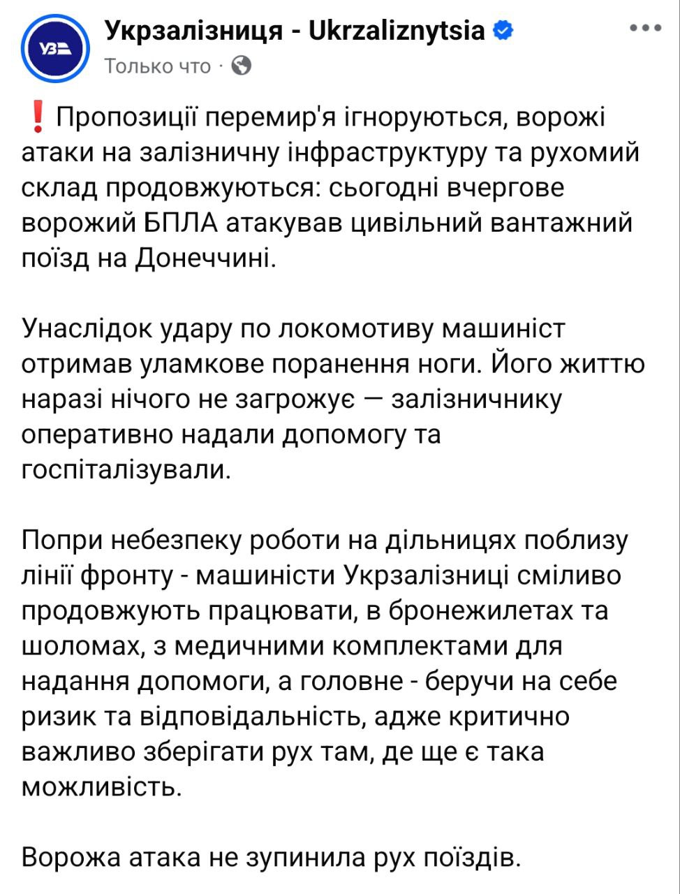7.40 Російський дрон ударив по вантажному потягу на Донеччині, повідомляє "Укрзалізниця". Поранений машиніст.