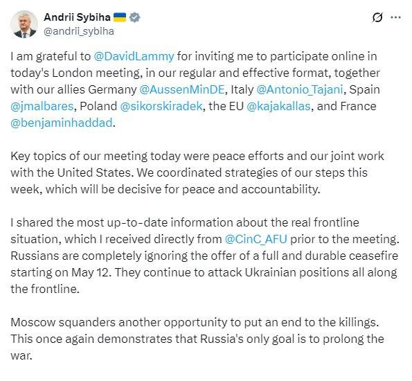 "Вони продовжують атакувати українські позиції по всій лінії фронту. Москва упускає ще одну можливість покласти край вбивствам. Це ще раз демонструє, що єдина мета Росії - продовжити війну", - написав міністр у Х.