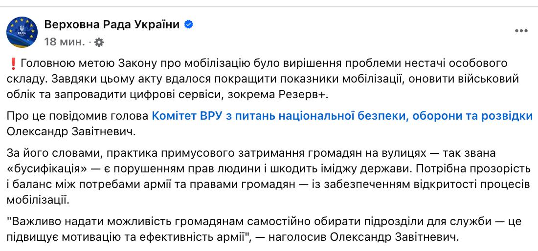 16:09 Верховна Рада перепостила думку голови комітету з нацбезпеки Олександра Завітневича, який раніше розкритикував бусифікацію та заявив, що "люто її ненавидить".