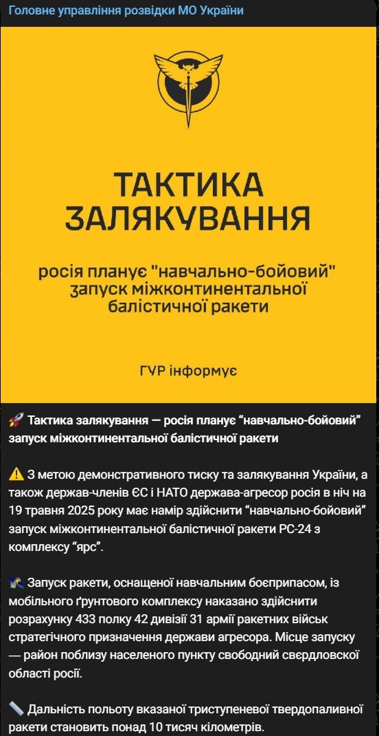 15:17 ГУР заявляє, що Росія планує цієї ночі "навчально-бойовий" запуск міжконтинентальної балістичної ракети РС-24 із комплексу "ЯРС".
