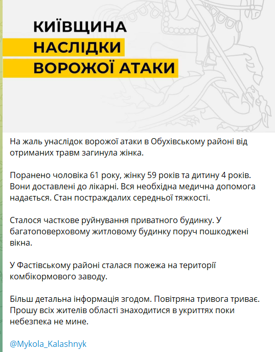 "На жаль, внаслідок ворожої атаки в Обухівському районі від отриманих травм загинула жінка", - йдеться у повідомленні.