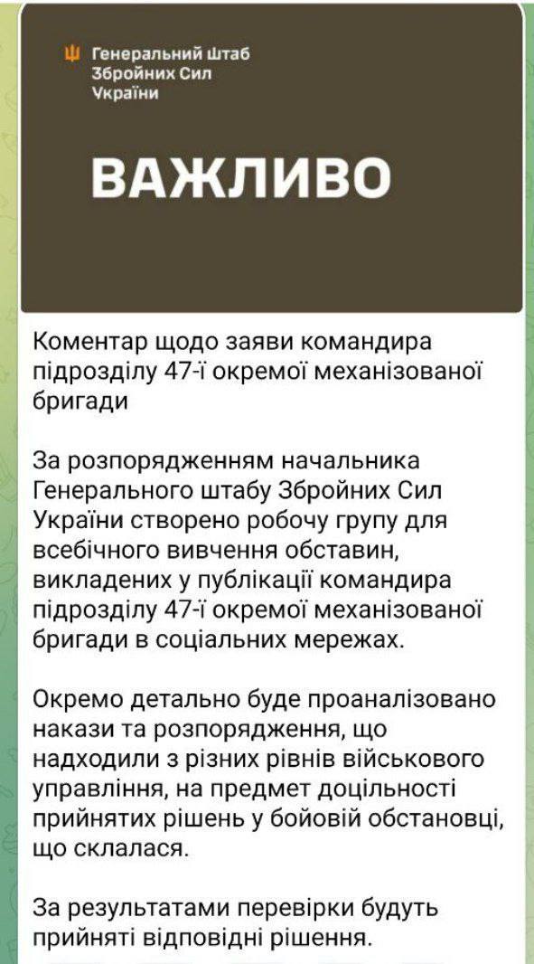 "За розпорядженням начальника Генерального штабу Збройних Сил України створено робочу групу для всебічного вивчення обставин, викладених у публікації командира підрозділу 47-ї окремої механізованої бригади у соціальних мережах", - заявляє Генштаб.