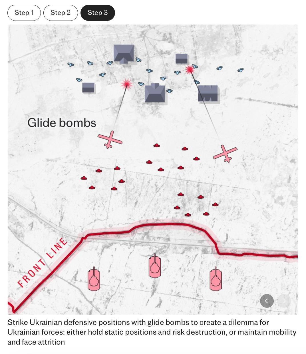 "Ось тут і виникає справді складна дилема, на яку насправді немає відповіді. Окопування і всі ці захисні заходи відмінно підходять для зниження втрат від артилерії або FPV, однак плануючі бомби зруйнують ці зміцнення і поховають людей", - коментує тактику науковий співробітник з сухопутних війн у Королівському університеті.