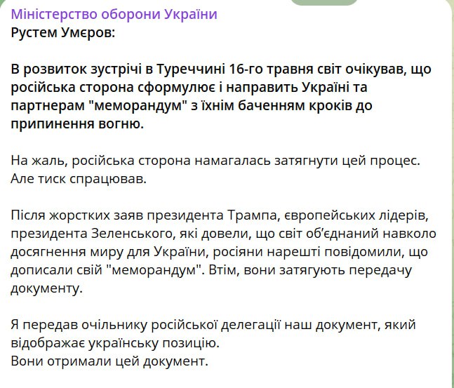 "Я передав голові російської делегації наш документ, який відображає українську позицію. Вони отримали цей документ. Ми підтверджуємо готовність України до повного і безумовного припинення вогню і подальшої дипломатичної роботи. Ми не проти зустрічей з росіянами і очікуємо на їхню "меморандуму", щоб зустріч була не порожньою і могла б бути не порожньою. не менше чотирьох днів до вильоту, щоб передати нам для обробки їхній документ", – заявив міністр оборони, побічно підтвердивши, що зустріч може відбутися 2 червня, як раніше повідомив глава МЗС РФ Сергій Лавров.