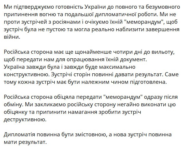 Перед цим в Офісі президента говорили, що не очікують, що Росія в меморандумі про майбутній мирний договір, що готується, висуне прийнятні для України умови миру.