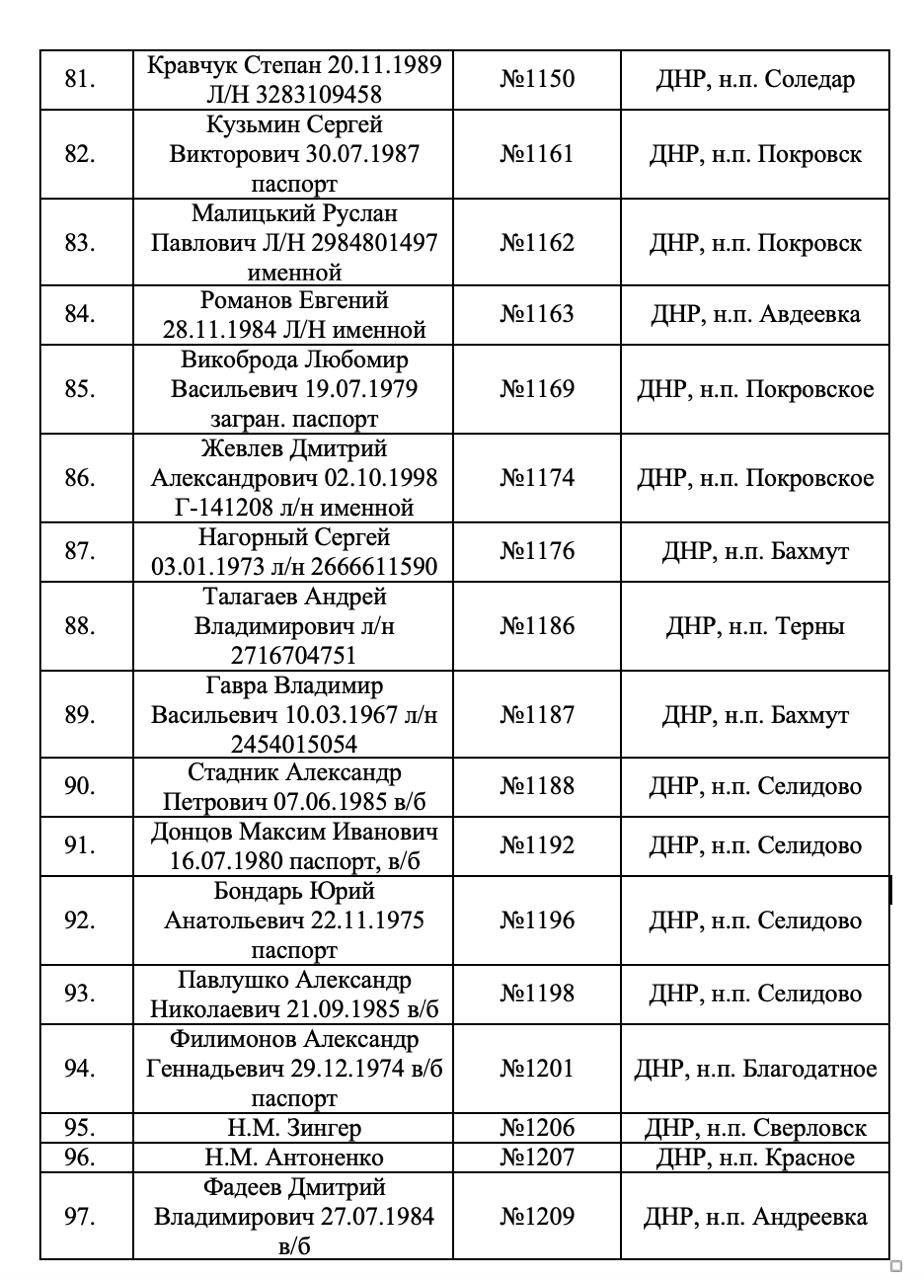 Чиновник виклав прізвища 121 військового, які загинули, як випливає з таблиць, на різних ділянках фронту від Курської до Донецької області. Судячи з усього, тіла були зібрані в різні періоди, оскільки в ньому значаться загиблі, зокрема, з Авдіївки, де основні бої точилися в 2023-2024 роках.