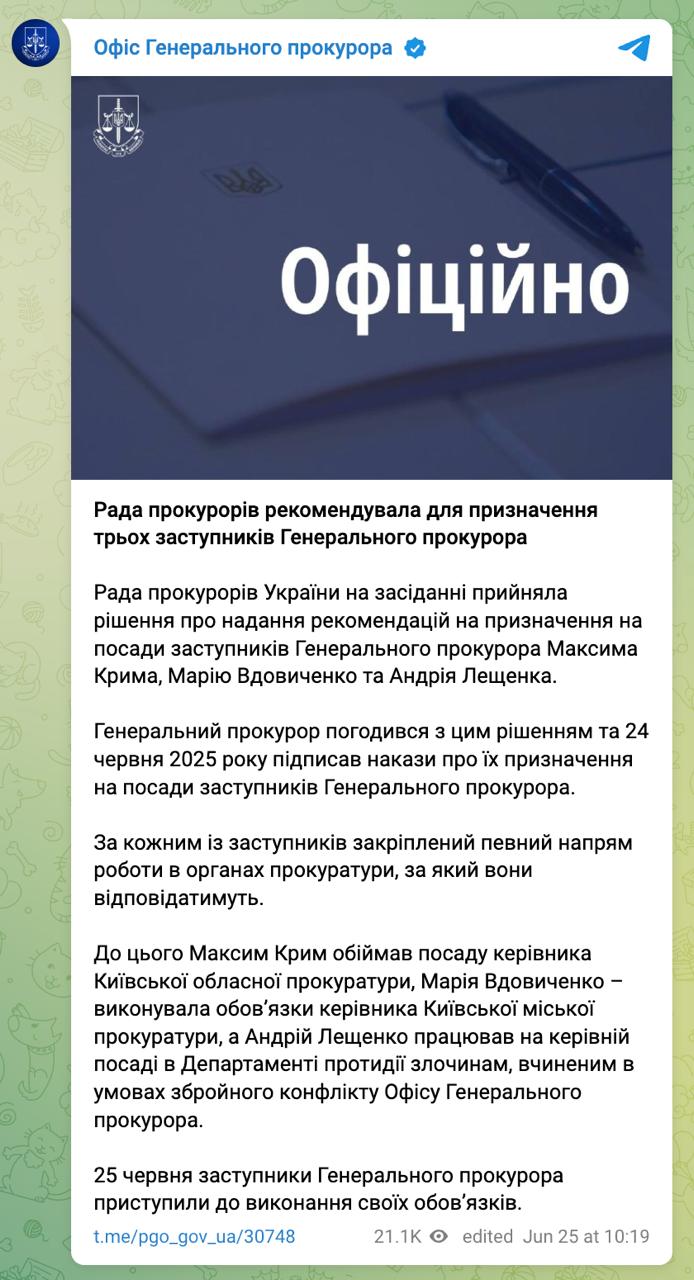 Рада прокурорів України на своєму засіданні ухвалила рішення про надання рекомендацій на призначення на посади заступників генерального прокурора Максима Криму, Марії Вдовиченко та Андрія Лещенка.